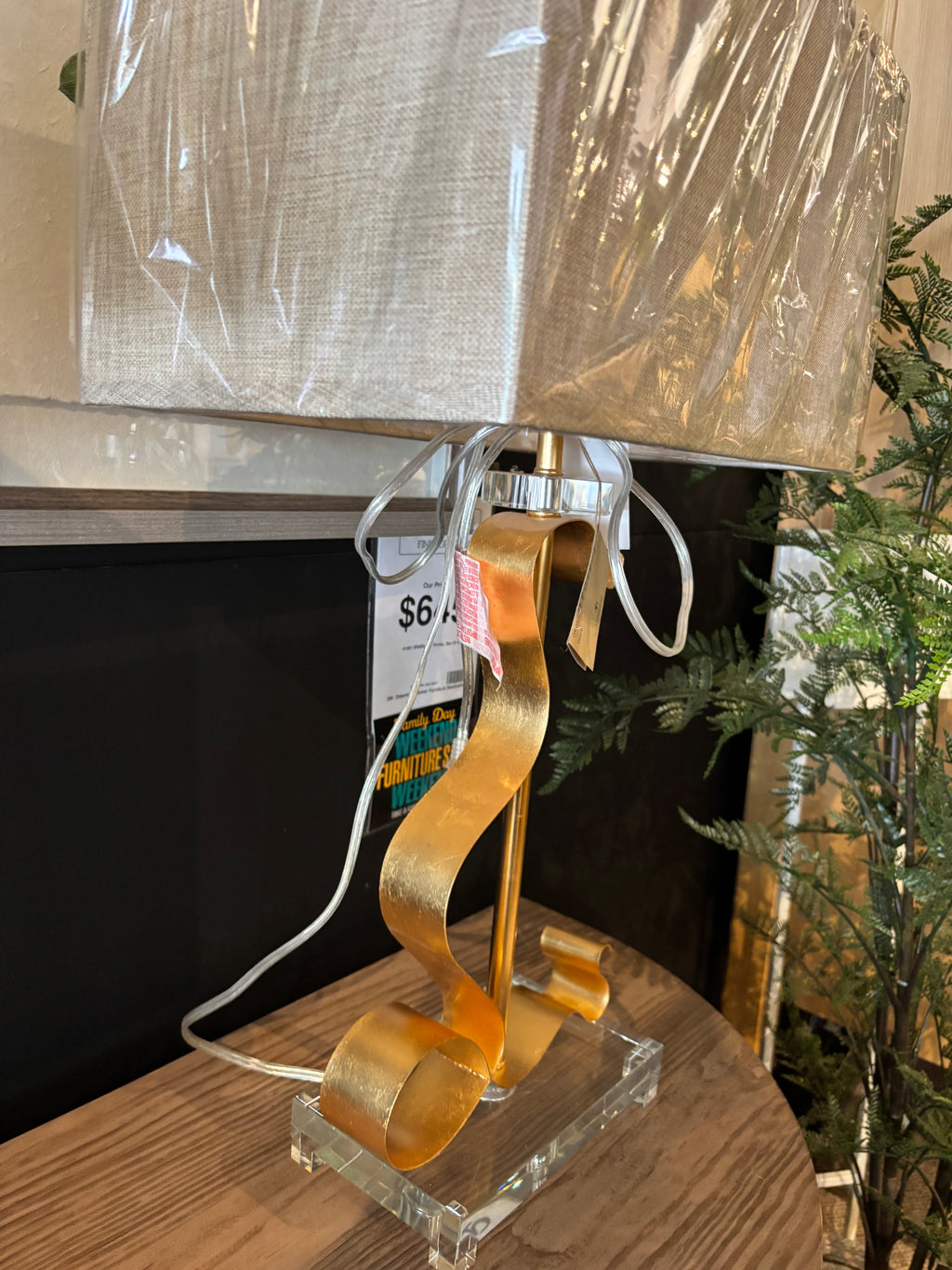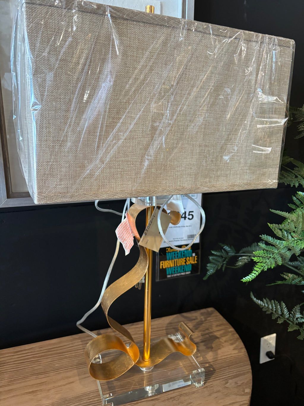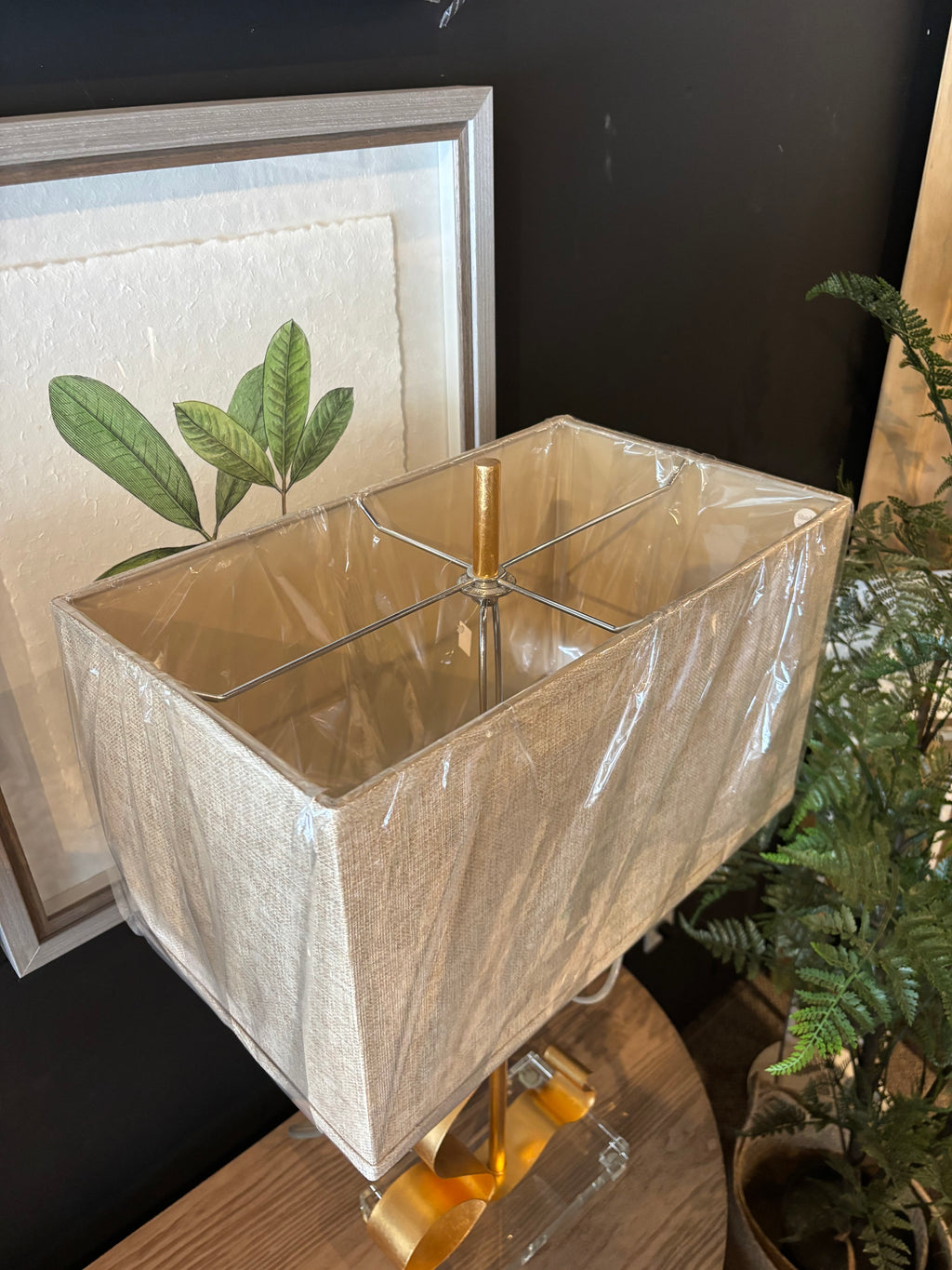 Final Sale. As Is. Sold as a pair. These modern sculptural table lamps are the perfect blend of sleek and... Final Sale. As Is. Sold as a pair. These modern sculptural table lamps are the perfect blend of sleek and organic. Featuring a clear acrylic base with a striking gold metal ribbon detail, they add an elevated designer feel without overpowering the space. Finished with a textured linen rectangular shade, these lamps give off a warm, soft glow—ideal for living rooms, bedrooms, or styled consoles. Dimensions: 17”W x 10”D x 30”H   View more