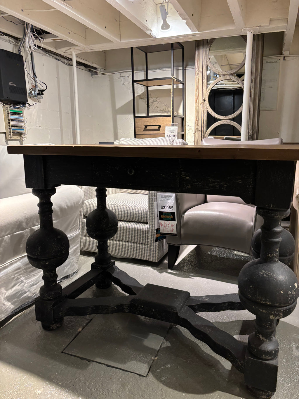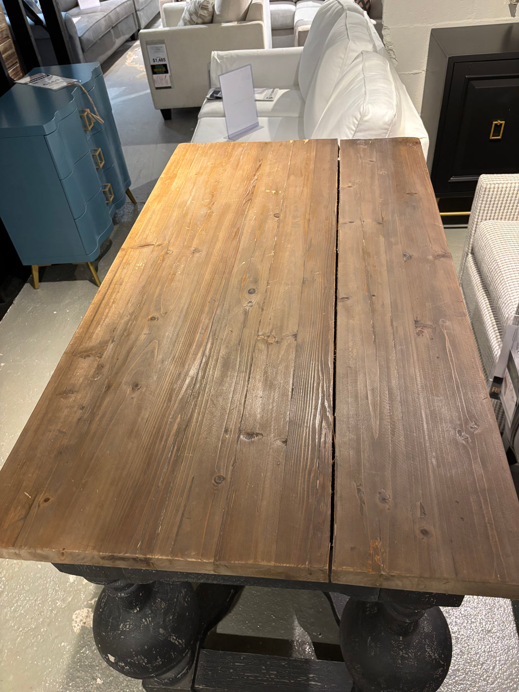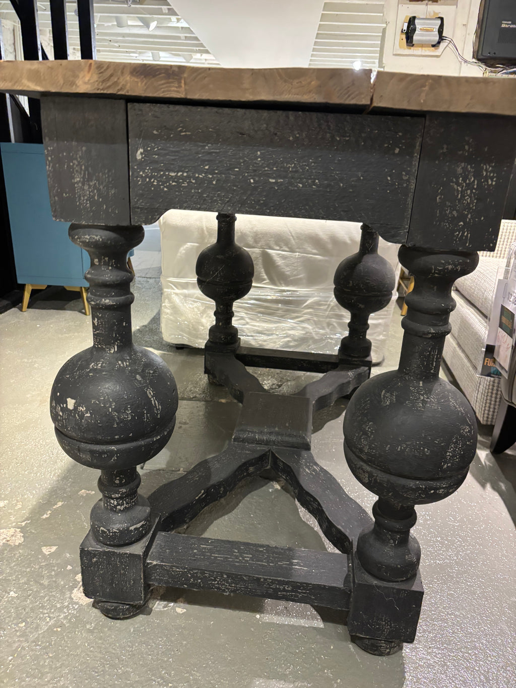 Final Sale. As Is. This statement table features a rich wood top paired with a bold black base and oversized... Final Sale. As Is. This statement table features a rich wood top paired with a bold black base and oversized turned legs for a dramatic, rustic look. The trestle-style design adds sturdy support and timeless character. Perfect for farmhouse, traditional, or eclectic spaces looking for a standout centrepiece. Dimensions: 27"D x 48"L x 36"H View more