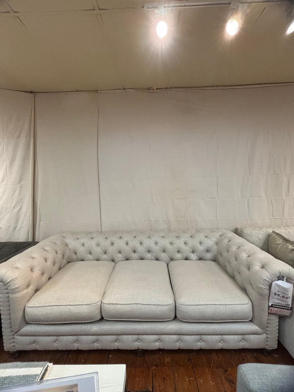 Final Sale. As Is. This tufted sofa brings timeless elegance and plush comfort to any living space. Featuring a classic... Final Sale. As Is. This tufted sofa brings timeless elegance and plush comfort to any living space. Featuring a classic rolled arm design with decorative nailhead trim and deep button tufting along the back, it offers a cozy yet tailored look. Upholstered in a soft neutral fabric, this piece pairs beautifully with both traditional and transitional décor. Dimensions: 98”W x 41”D x 32”H View more