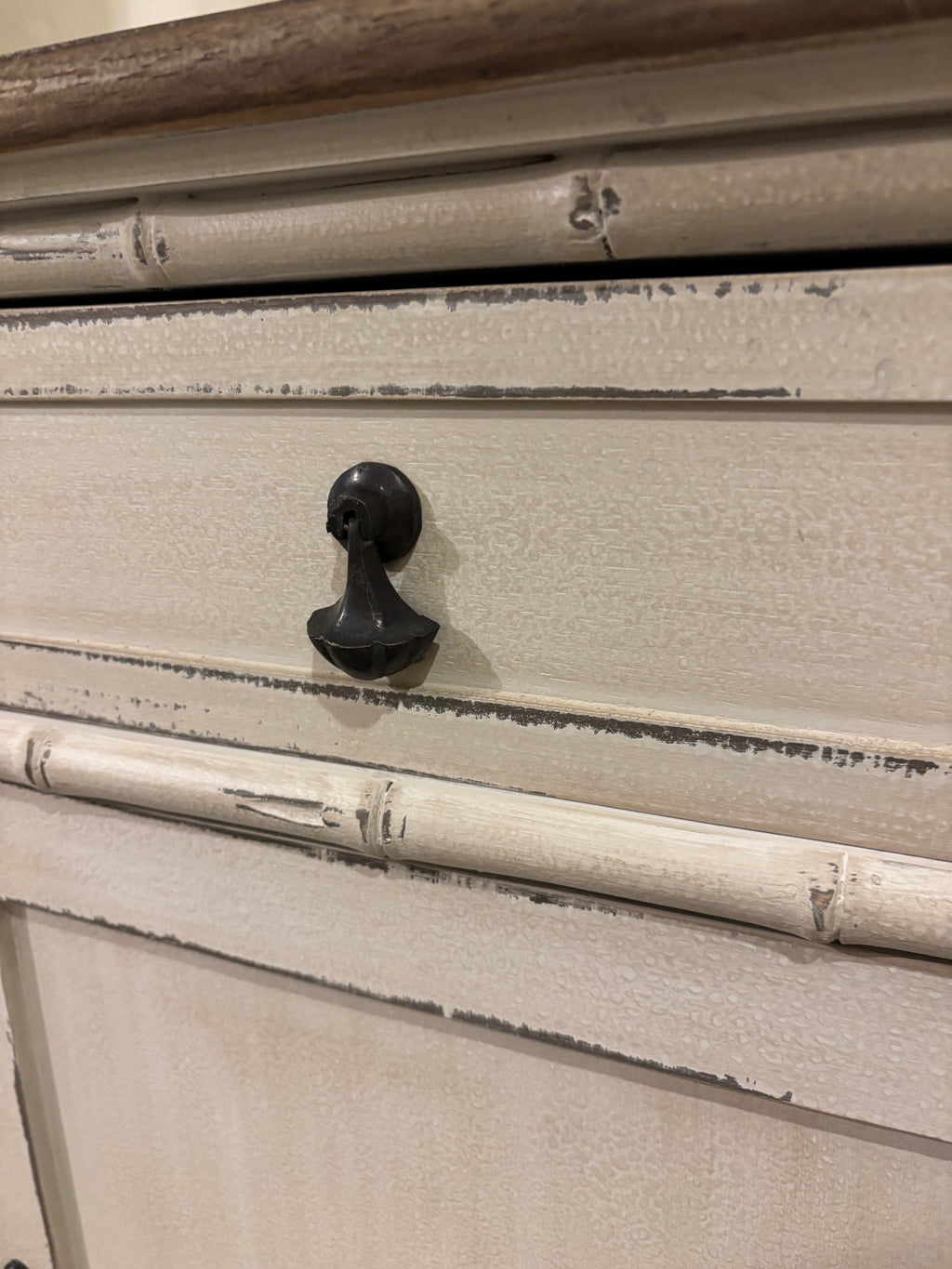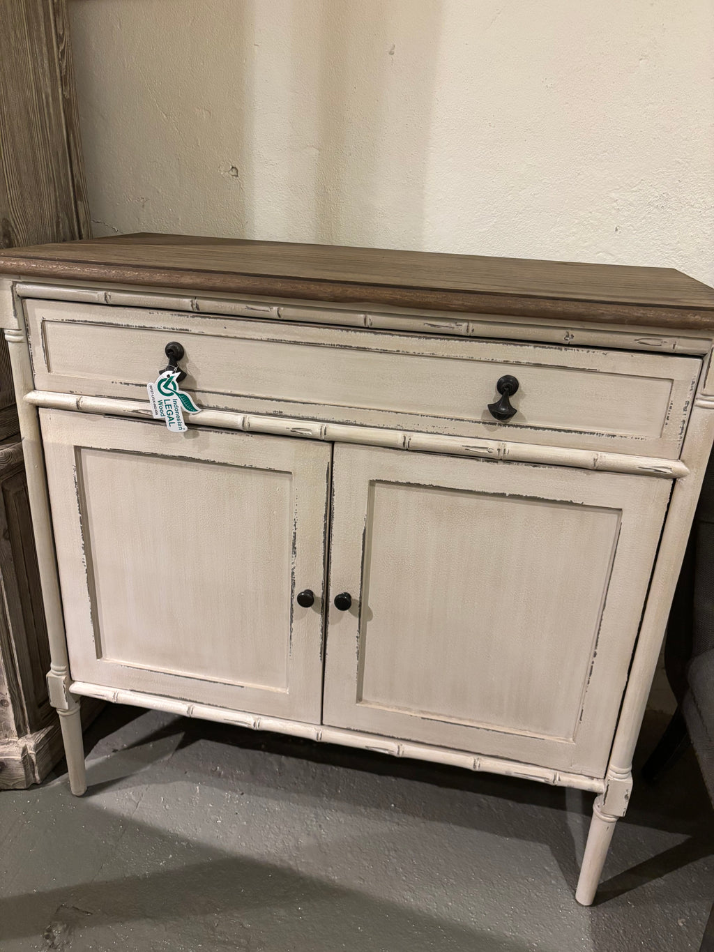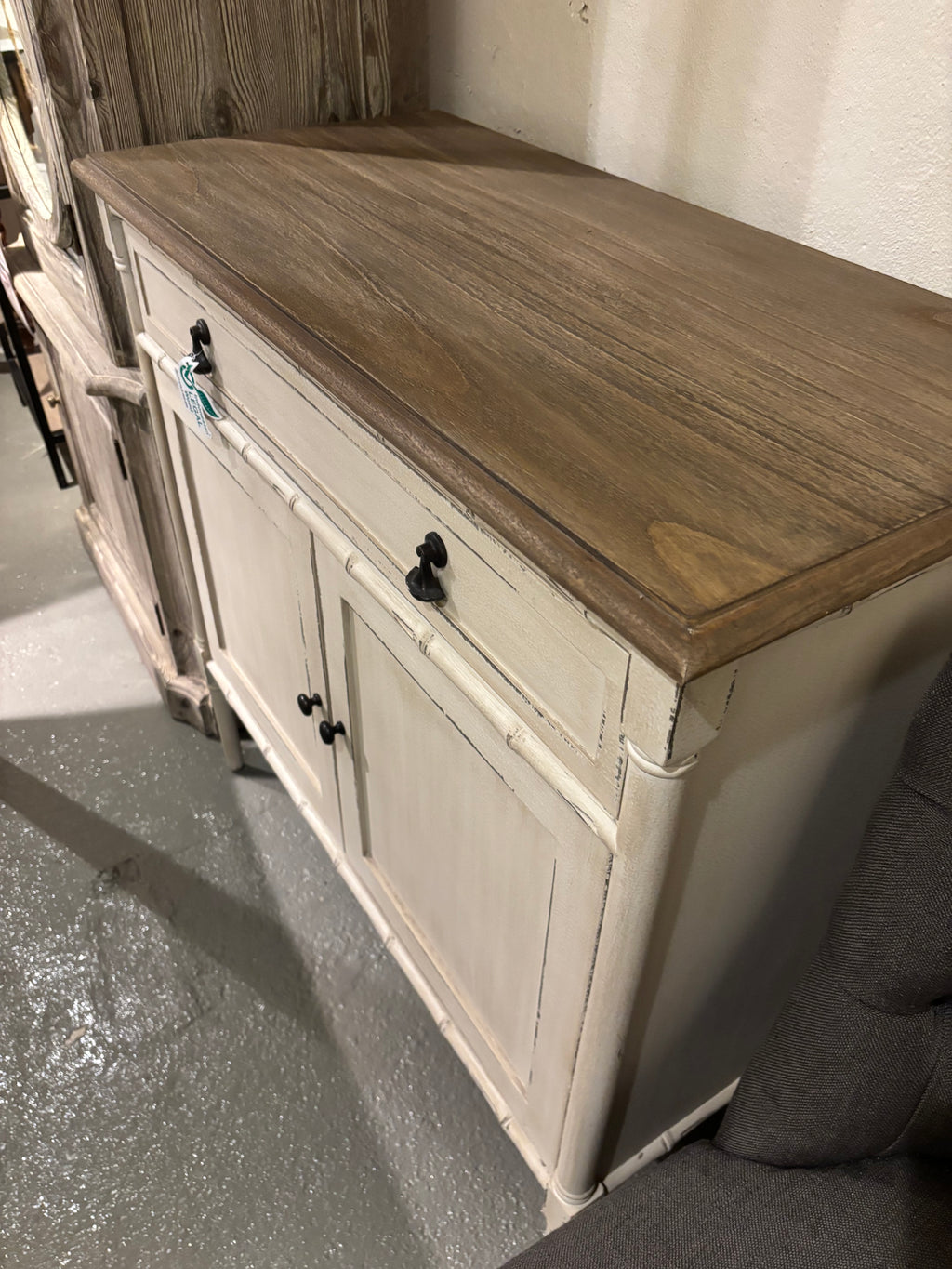 Final Sale. As Is.  This charming cabinet features a distressed white finish with a warm wood top for a classic... Final Sale. As Is.  This charming cabinet features a distressed white finish with a warm wood top for a classic farmhouse look. With two doors and a spacious drawer, it offers practical storage for dining rooms, entryways, or living spaces. A perfect blend of rustic character and everyday function.  Dimensions: 17”D x 36”L x 35”H  View more