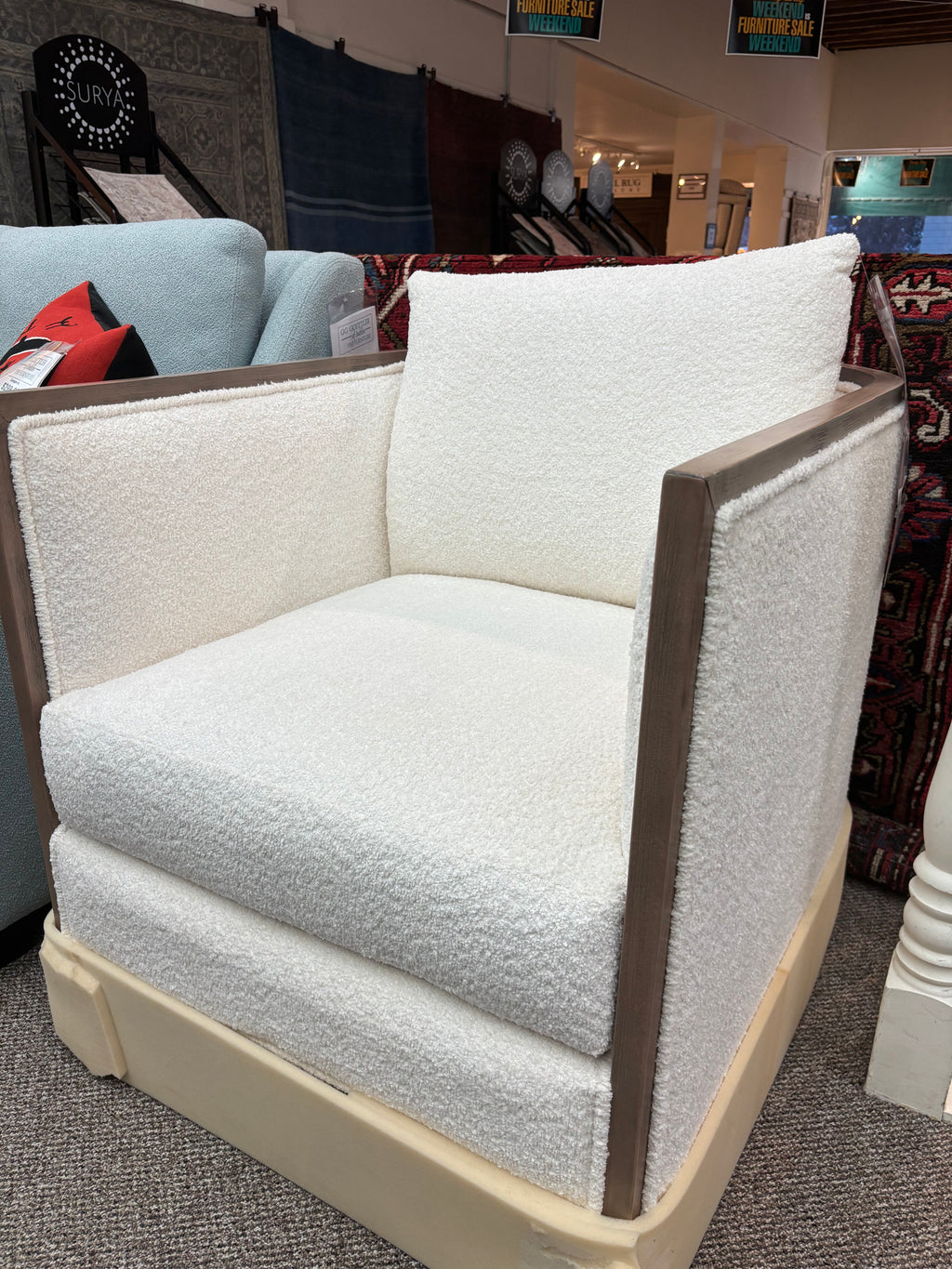Final Sale. As Is. Modern lines, warm texture, and beautiful wood accents make the Décor-Rest 6310 chair an easy statement... Final Sale. As Is. Modern lines, warm texture, and beautiful wood accents make the Décor-Rest 6310 chair an easy statement piece. Proudly Canadian made with exceptional quality.  Protective foam wrap has been kept on the base to keep it clean while on display. Dimensions: 28”L x 36”D x 35”H View more