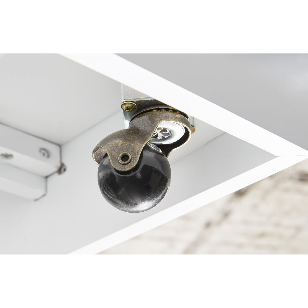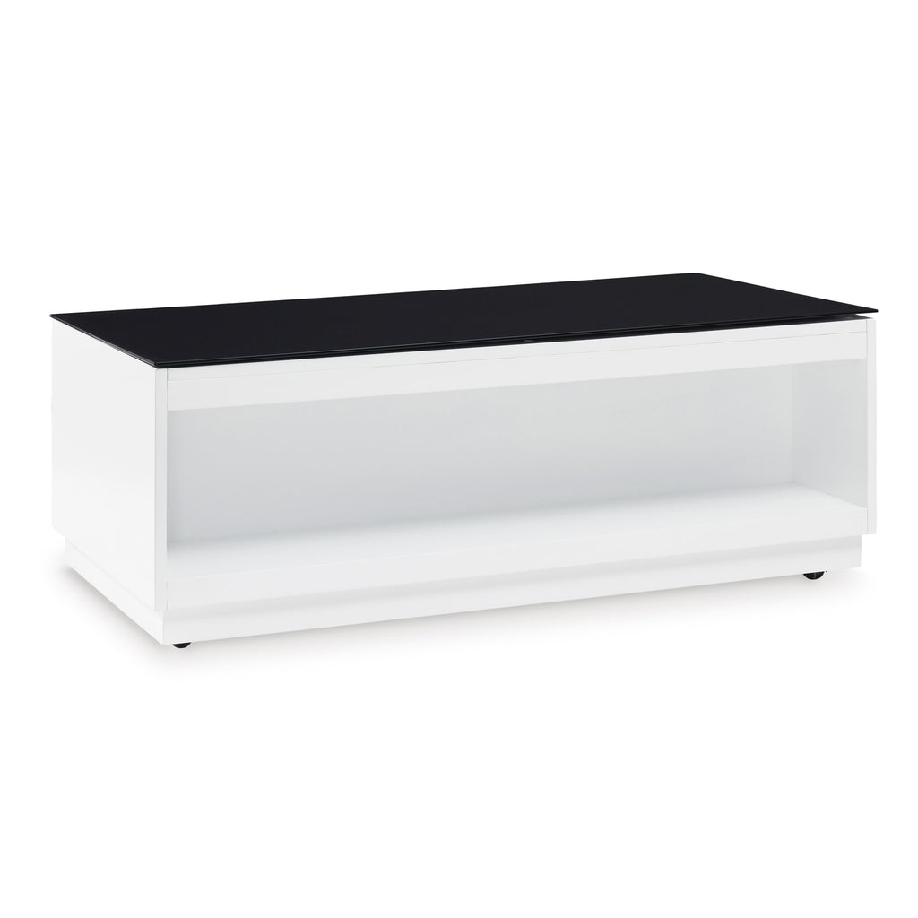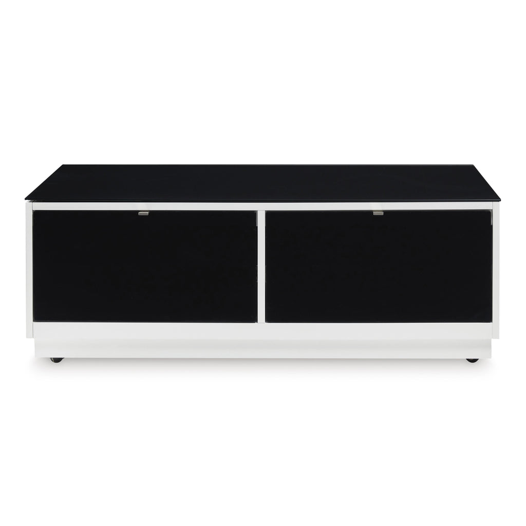 • Black glass tabletop; black acrylic laminate drawer fronts