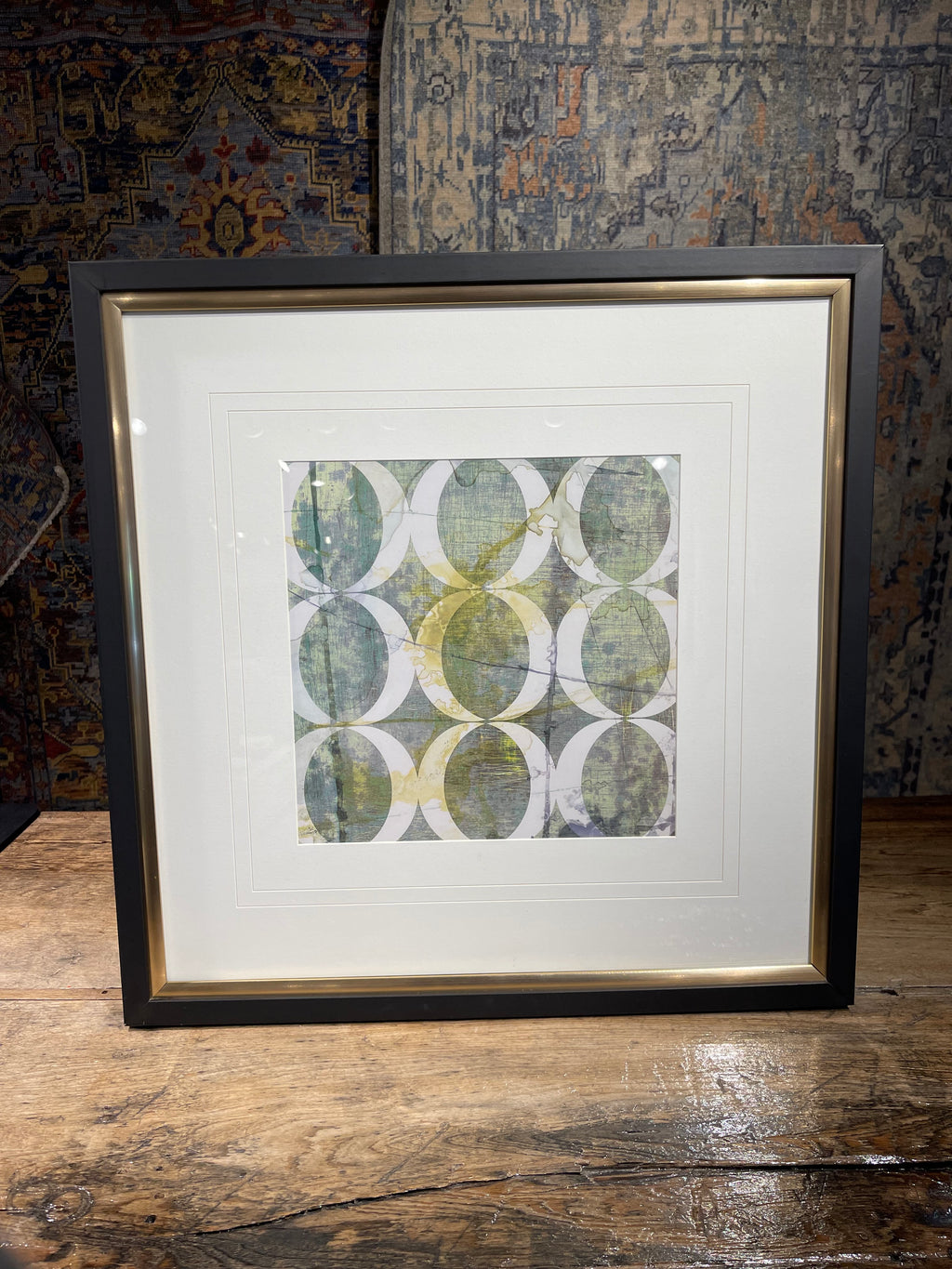 Geometric prints, group of 4, in an green/white combo with brown frames.